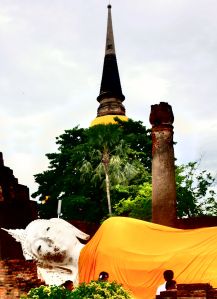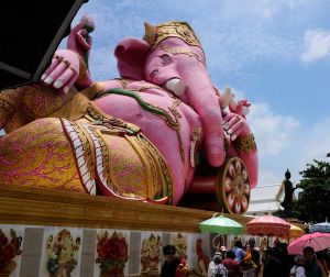 I spent some of last week visiting temples.  Not the Wat Pho complex, which I’d already seen; but instead, I took a taxi a bit out of town and visited some non-touristy big temples.  For the most part I was the only farang around.  At least the only flesh and blood farang.  For Mickey was there with me, at least in spirit.  Thai Buddhism has assimilated all the animal tales of Buddha’s earlier re-births as well as a full cast of Hindu Apsaras, Rakshas and other minor dieties plus Chinese dragons.  The result is that the grounds of these temples look like menageries with fantastic beasts sprinkled in.  It’s more a playground with places for kids to play and for families to picnic which supports activities like ringing bells, hanging flower wreaths on statues and putting little pieces of gold leaf on exposed parts of the Buddha’s bod like his toenails.  I imagine folks are perfectly serious about making their prayers and offerings, but they’re neither solemn nor particularly silent.